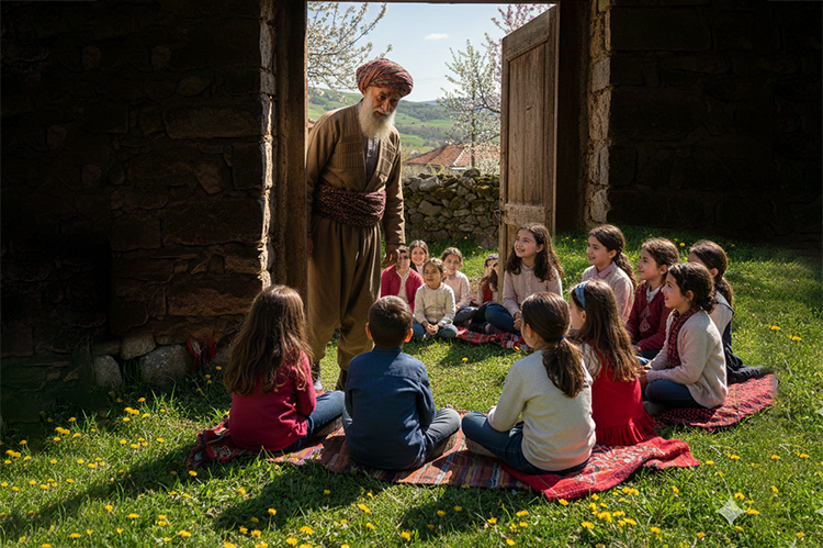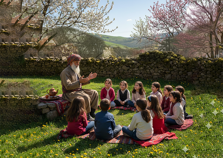 Nametê Şehîn ji xew radibe û di pencereya xwe re li hewşê dinere. Dibîne ku zarok ji zû ve hatine û li benda ’çîrokek nû’ ne. Hevjîna wî, Helîma Kêlo dibêje, ‘tu îro dereng mayî, zarok ji serê sibehê ve li benda te ne. Tu here bi wan ve, ezê jî hinek mewîj, bastîq û helîl derbixim û ji we re bînim’.